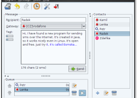 Program for sending SMS over the Internet. It uses publicly available web gateways and sends messages through them. This way it can be much more comfortable than using a web browser or a mobile phone.