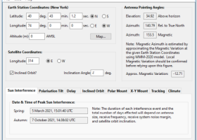GEOPoint is an easy to use satellite antenna pointing calculator, for geostationary communications satellites. It calculates the azimuth and elevation pointing angles from a given location on the earth towards a specified geostationary satellite. The program also calculates polarisation tilt angles, estimates dates and times of annual sun-outage events, calculates antenna G/T, EIRP and frequency stability, and estimates path-loss and rain-attenuation based on ITU-R climate models. As used by Hausfeld Consulting for satellite communications planning.