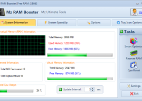 Mz RAM Booster is a program created to improve the performance of your computer by auto-recovering RAM and fine tuning some Windows system settings! It uses minimal resources and almost no CPU time.