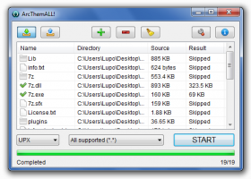 ArcThemALL! is a handy and easy to use multi-compressor of files and folders with UPX, MPRESS, ZIP and 7Z formats. It includes an intelligent UPX compression mode, the support to self-extracting archive creation, the encryption/decryption of archives, the extraction of several archive formats (7Z, ARJ, BZIP2, CAB, CHM, CPIO, DEB, DMG, GZIP, HFS, ISO, LZH, LZMA, MSI, NSIS, RAR, RPM, TAR, UDF, UPX, WIM, XAR, Z and ZIP) and much more.