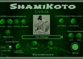 ShamiKoto is a virtual Koto (13-stringed) and Shamisen (three-stringed lute) designed to emulate those traditional Japanese stringed instruments. Includes pre-recorded koto glissandos as well as a few shamisen technique emulations with plectrum (bachi) or finger, like hajiki (left hand finger plucked-string), sukui (bachi upstroke), and tataki (bachi swift downward stroke). Available as plugin in VST 32 bit and 64 bit and VST3 64 bit versions for Wi Features: 01 • Koto 13-Stringed 02 • Koto Staccato 03 • Koto Trill Effect 04 • Koto Glissando 1 Ascending (Straight) 05 • Koto Glissando 2 Descending (Straight) 06 • Koto Glissando 3 Ascending (Straight) 07 • Koto Glissando 4 Descending (Straight) 08 • Koto Glissando 5 Ascending (Straight) 09 • Koto Glissando 6 Descending (Straight) 10 • Koto Glissando 7 Ascending (Wavy) 11 • Koto Glissando 8 Descending (Wavy) 12 • Koto Glissando 9 Ascending-Descending Set 13 • Shamisen 3-Stringed Lute 14 • Shamisen (Hajiki/Left Hand Finger Plucking) 15 • Shamisen (Sukui/Bachi Upstroke) 16 • Shamisen (Tataki/Bachi Downstroke) • Low Frequency Oscillator Section: These knobs apply modulation to the selected instrument. By using the LFO to modulate various aspects of the audio signal, you can apply effects such as vibrato or tremolo. • ADSR envelope generator with Attack, Sustain, Decay and Release parameters. • Pitch Bend: The Pitch Bend knob directly changes the pitch of the selected instrument. • Reverb built-in: provides a spaciousness and depth to simulate the sound reflections from walls, floors and ceilings following a sound created in an acoustically reflective environment. Small rooms can be modeled as well as large spaces. • Filter Section: with filter type box for low pass filter and high pass filter. • Amplitude Range Parameters: It controls the loudness, the way in which we perceive amplitude.The sensitivity level is set by the user. • Panning potentiometer control. • MIDI CC Automation