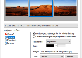 With display profiles, you can quickly change the settings of one or more monitors. You can also create a display profile that gets applied when logging in, especially useful when the computer is used by more than one person, and not everyone wants to use the same display settings. The UltraMon wallpaper manager adds the ability to use a different picture on each monitor, or stretch a single picture across the desktop. Some screen savers only run on the primary monitor. UltraMon can blank the secondary monitors when the screen saver is running, or run additional screen savers on secondary monitors. Mirror the primary monitor on one or more secondary monitors, for example when doing a presentation. Or mirror only a single application on a secondary monitor. A unique feature is support for different resolutions, the source monitor can run at a higher resolution than the mirror monitor. UltraMon provides a custom Display Settings applet with support for configuring more than 10 monitors. You can quickly configure even large numbers of monitors using the included monitor arrangement tools.
